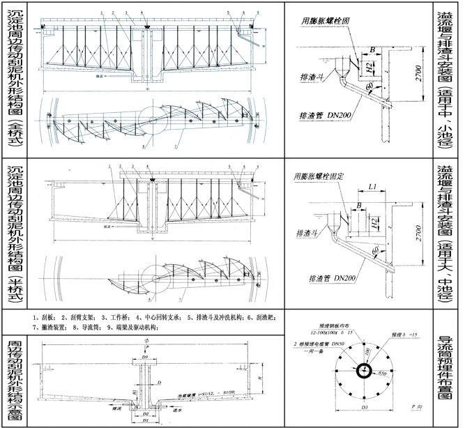 ZBG型周边传动刮泥机采用周边传动,污水从池中心的进水管流入,经稳流筒扩散后,均匀的向周边呈辐射状流出,呈悬浮状的污泥经沉淀后沉积于池底,驱动装置驱动工作桥架沿周边旋转,并带动刮臂及刮泥板转动,将污泥从池周刮向中心集泥槽后,靠池内静水压由排泥管排出池外,水面上的浮渣通过撇渣装置撇向池边,再由刮渣耙刮进排渣斗内排出池外;而上清液则通过三角形出水堰板溢入出水槽内排出。