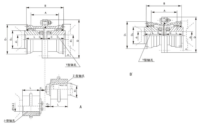 轴孔长度 | D | D1 | D2 | B | A | C | C1 | C2 | e |